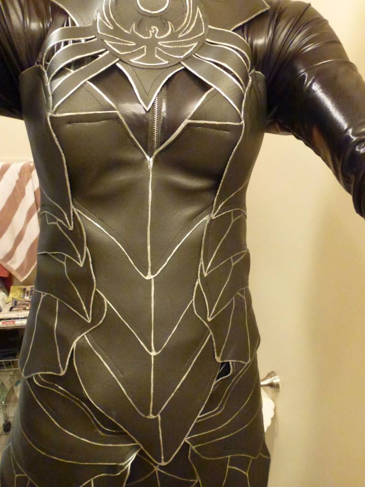 I spent a ton of time researching cosplayers like Kamuii and Lightning cosplay and watching tutorials, looking up fabrics and so on. Hours and hours and hours. So i decided to order myself some Worbla. Now to this day i still have a partially completed breastplate that is in the shape of a nightingale that i never used. After completing it i decided it wasnt accurate to the character and that they would probably have a leather armor more so than an actual, hard armor. Next i bought some Vinyl. This was better, still hard to work with and i had no idea how to sew, but it was working! (I bought an ancient sewing machine from a lady at work) So progress was made!
