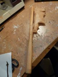I started by carving everything from your run of the mill styrofoam, then smoothing it out with some sand paper. Next i covered everything in Worbla, the handle included (made from PVC pipe and craft foam) .