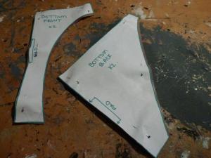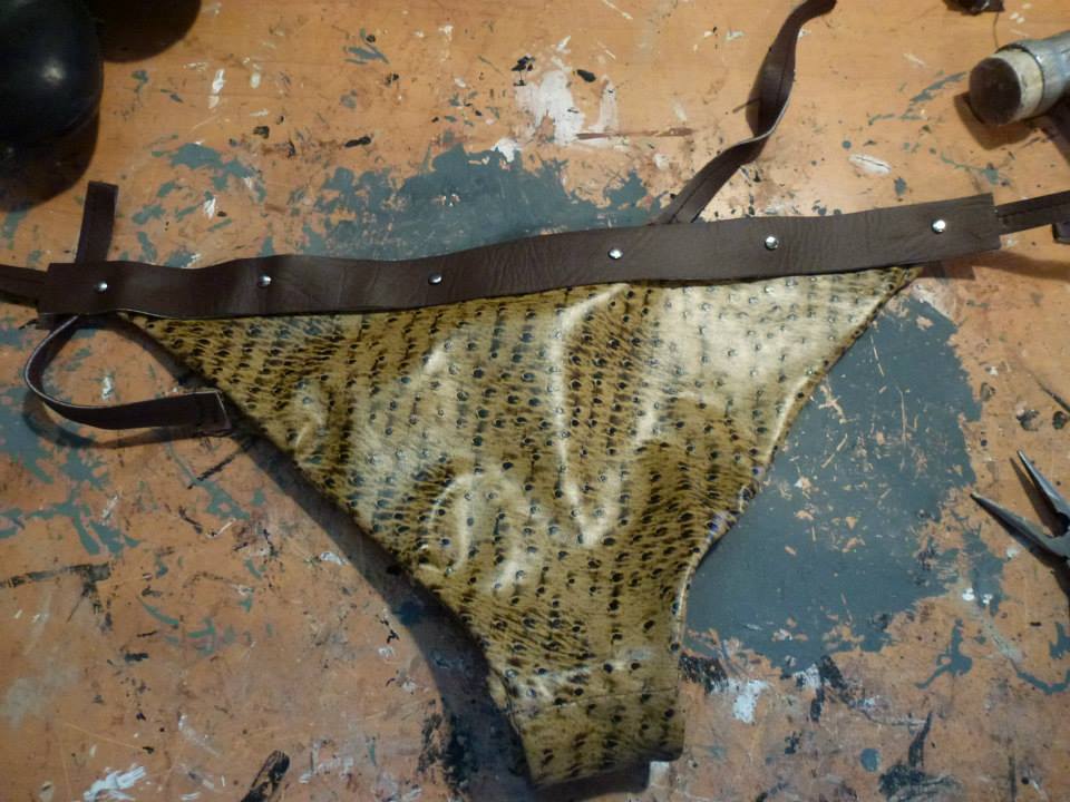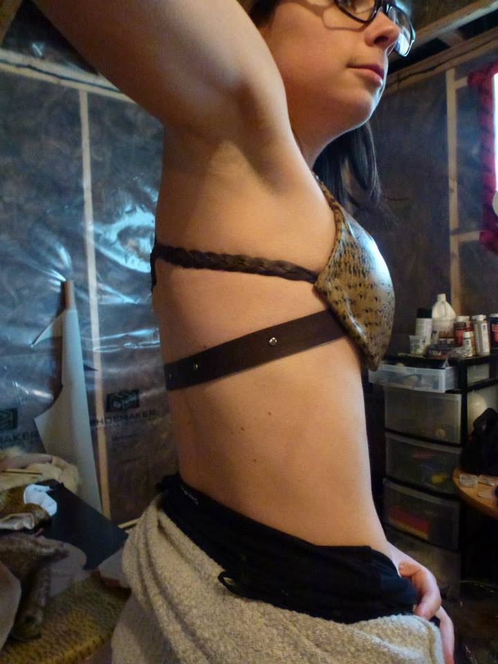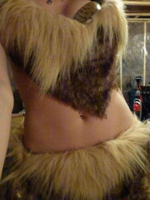 First i started on the undergarments. I took an old bra and covered it in the vinyl. I cut off the straps and made some more fitting to the costume. Technically they dont have any sort of straps in the game… buuuttt i was not comfortable just leaving a flap of fur covering my chest and then walking around at an expo.