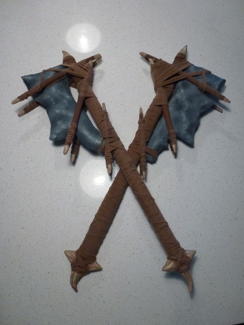 I decided that i wanted to dual wield some axes. Because that sounded pad ass. Haha. These were the second props i EVER made and are still one of my favorites.