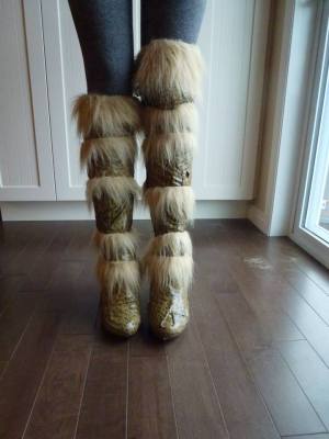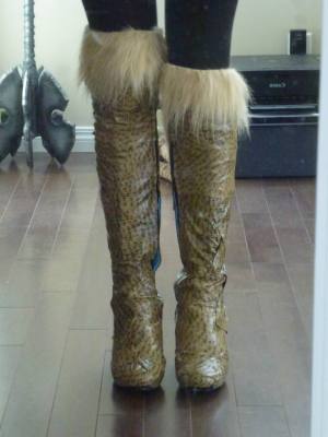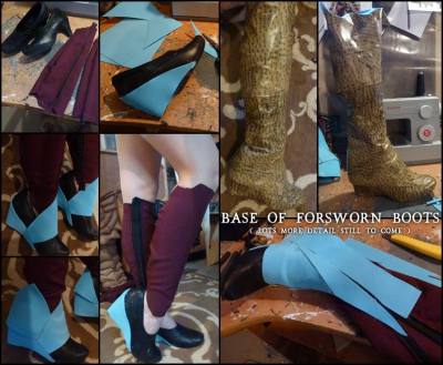 Once i had that all finished I started working on the boots. this in its self was quite a process! I started by getting some old comfy shoes and making the base shape with fabric and craft foam. I put a zipper in the side of the fabric so that i can get the boots on and off easily without ripping them. After that i just glues strips of the ugly vinyl all over it until i got a boot!